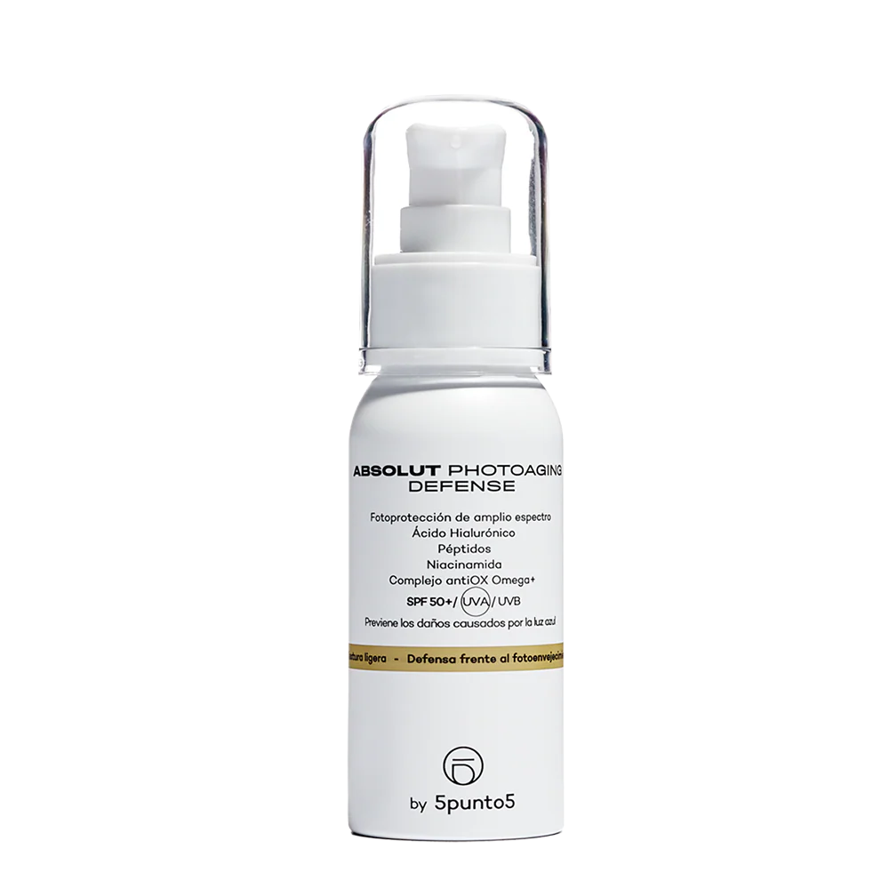El fotoprotector urbano Absolut Photoaging Defense de 5punto5 es una crema antiedad de día en la que se combina defensa y prevención diaria con el cuidado absolut antiedad. Es un protector solar facial antiedad de uso diario indicado para todo tipo de pieles, como paso último y esencial en la rutina de cuidado facial de día.