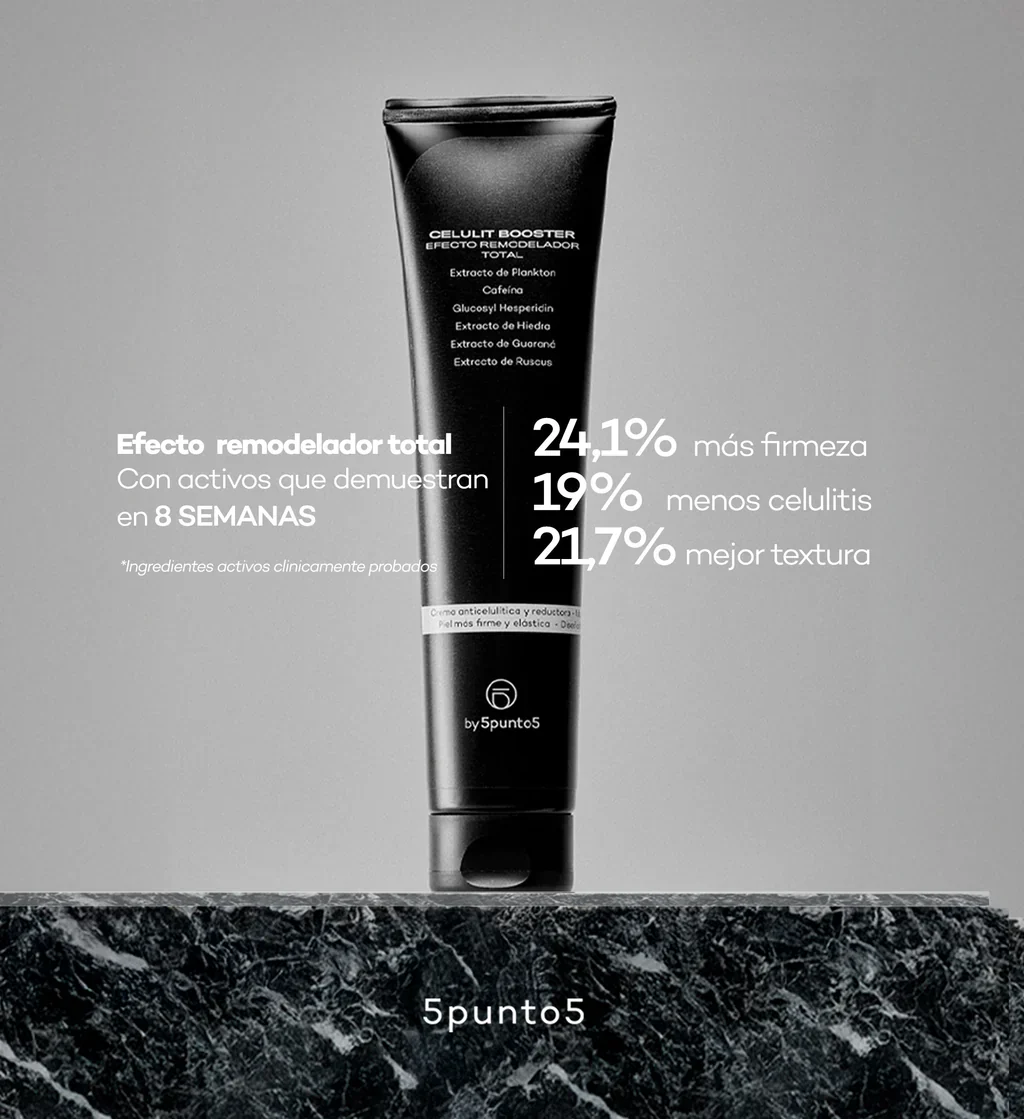 Celulit Booster de 5punto5 es una crema corporal de rápida absorción diseñada científicamente para combatir la celulitis y mejorar la silueta. Su fórmula combina ingredientes activos con elevada evidencia científica, como el Extracto de Plankton, clínicamente demostrado para reducir hasta 5,7 cm en muslos y 5,5 cm en caderas, disminución de celulitis en −21,7 %, y mejora de firmeza +24,8 % en estudios in vivo.