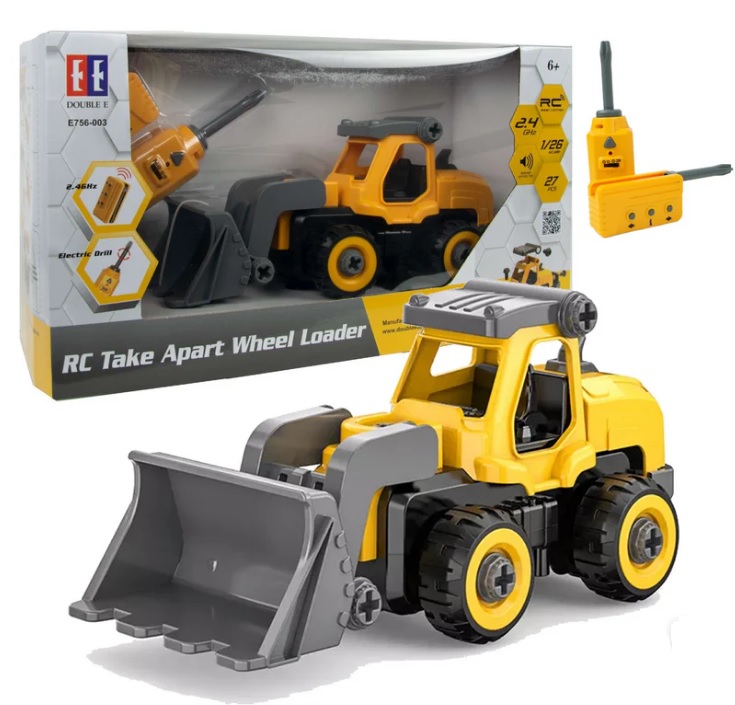 máquina de juguete o miniatura de una retroexcavadora de la marca Double E, que incluye accesorios y tiene dimensiones aproximadas de 37.9 cm de largo, 14.7 cm de ancho y 21.5 cm de alto, destacando su pala frontal removible, ideal para juegos de construcción infantil. perfecto para niños interesados en la construcción, que ofrece juego interactivo con su pala removible y accesorios adicionales.